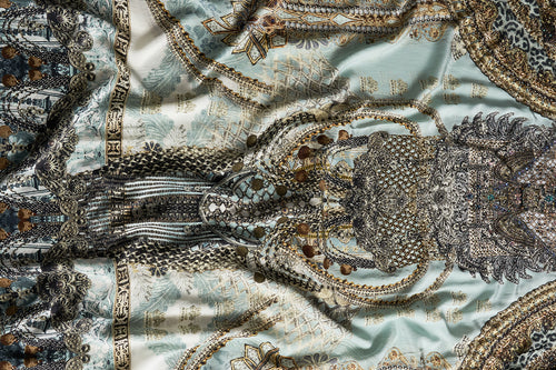 A moment described by ethereality, the Free Espiritu Wrap Dress With Draped Sleeve is an effortless blend of silver and gold cascades, a sea of icy blue hues and chain details. Hand-embellished with signature CAMILLA