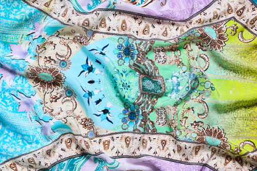 Transporting us to the meadows of India with a single step, the Turn Back Time Curved Hem Pant graces the eye with turquoise paisley indulgence, muted gold floral detailing and intricate panels of tantalising teal. Complete with hand-embellished CAMILLA crystals, these luxury silk pants feature an elasticated high-rise waist with drawstring accents, gold hardware detailing, a softly shaped hemline that dips into a soft billow and an effortlessly relaxed silhouette.