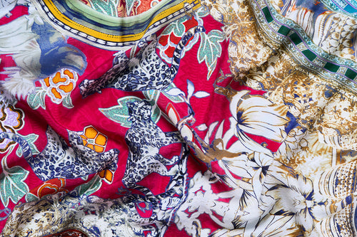A concoction of gemstone tones infused with ancient wonder, our Taste Of Twilight Shirred Cuff Blouse is enveloped by cascades of leafy vines, raspberry botanicals and intricate golden architecture upon a sea of rich ruby hues. Adorning hand-embellished CAMILLA crystals, this luxury silk blouse features a billowy blouson sleeve, a deep v neckline that meets intricate pattern details, shirred accents at the cuffs and a relaxed silhouette made perfect for French tucks.