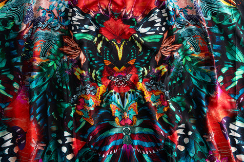 Vibrant swimwear designed with Mother Earth in mind, the In A Flutter V High Leg Pant is encased in a rich sunset hue adorned with cascades of gemstone-toned butterflies, sky blue botanicals, ethereal wing mosaics and the blossom of forest fern. Crafted from ECONYL® regenerated nylon, this sustainable bikini bottom features a high rise silhouette to elongate the leg, a v-style cut to shape the waist and hand-embellished CAMILLA crystals.