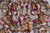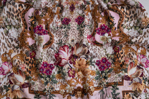 The Bambino Bliss Raglan Button Up Shirt echoes the sweet symphony pastel pinks awashed in opulent florals and leopard print dancing beneath gilded archways. Crafted with crystal adornments, this luxury silk blouse plays host to