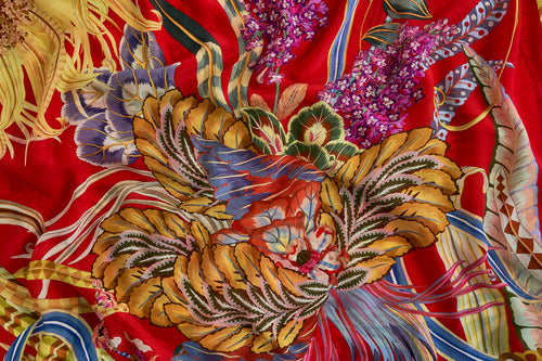 The Through Vincent's Eyes Straight Leg Pant depicts bold sunflowers and feathered flourishes against vibrant red. Crafted from the opulent embrace of signature silk, these statement pants host an elasticated drawstring waist that cinches and