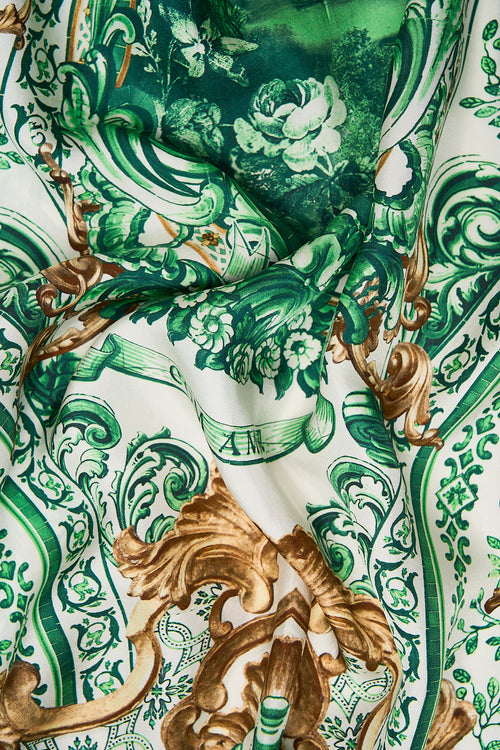 Designed in Australia, The Corridor Of Calm Waist Tie Shirt Dress is a tribute to Queluz Palace, entwining CAMILLA motifs with calming hues of green and gold. Azulejo tiles and architectural elegance unite, evoking peace and grandeur in every glance. Lovingly handcrafted, this elegant CAMILLA silk shirt dress showcases a sleek collar detail that flows into a button-through enclosure on a slightly relaxed fit straight silhouette across the body. Relaxed full-length sleeves are adorned with wide split cuffs that fall past the wrists to create a visually elongated line to this exquisite silk mini dress.