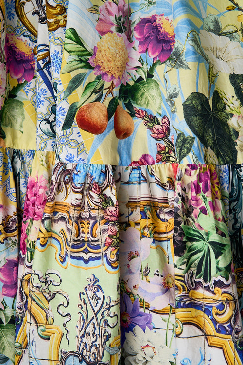 Designed in Australia, The Flor Fantástica Necktie Dress With Elasticated Waist echoes the splendour of Queluz Palace, soft yellow hues bloom amidst florals inspired by its lush gardens. A celebration of nature's elegance and timeless