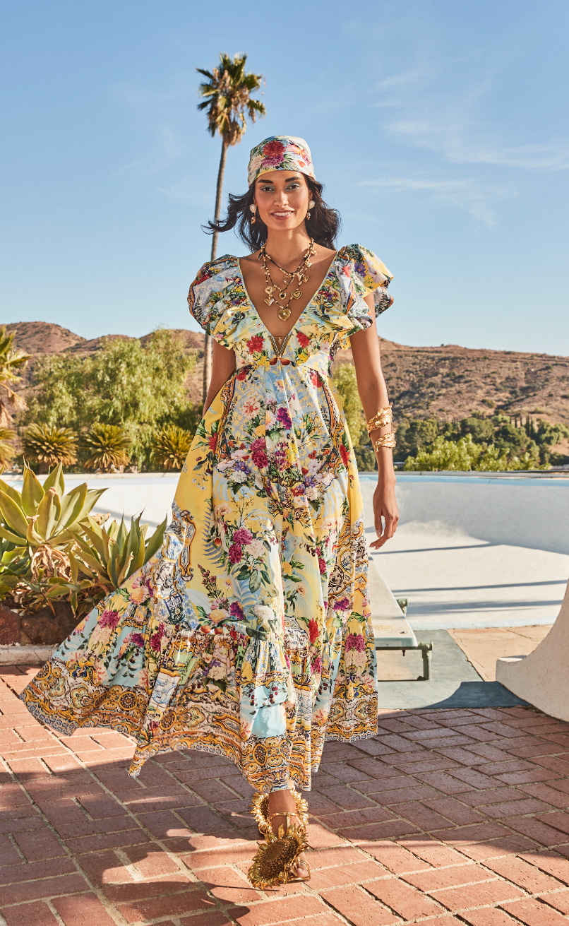 Designed in Australia, The Flor Fantástica Necktie Dress With Elasticated Waist echoes the splendour of Queluz Palace, soft yellow hues bloom amidst florals inspired by its lush gardens. A celebration of nature's elegance and timeless artistry. Lovingly handcrafted, this luxury silk maxi dress features an elegant high neckline with a softly blouse bodice that cinches into the adjustable waistline. The full length skirt flares from the waist and is finished with a wide ruffle hemline.