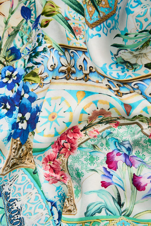 Designed in Australia, The Sunrise In Sintra Shirred Waist Detail Mini Dress celebrates lush gardens and eclectic nineteenth-century architecture, where light blues and intricate tiles reflect exotic motifs, inviting you into botanical beauty. Lovingly handcrafted, this luxury CAMILLA silk mini dress homes a plunging V neckline with a drawstring under bust detail. The shirred elastic waist cinches and shapes to create a softly gathered mini skirt adorned with a ruffle hem detail that falls to a mid thigh hemline.