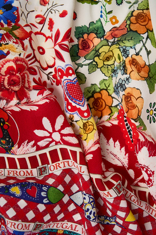 Designed in Australia, The Faith, Luck & Justice Waist Tie Button Through Shirt draws you into the heart of Portuguese folklore—where the Barcelos Cockerel and vibrant fish motifs dance among colourful blooms and kitchy textiles,