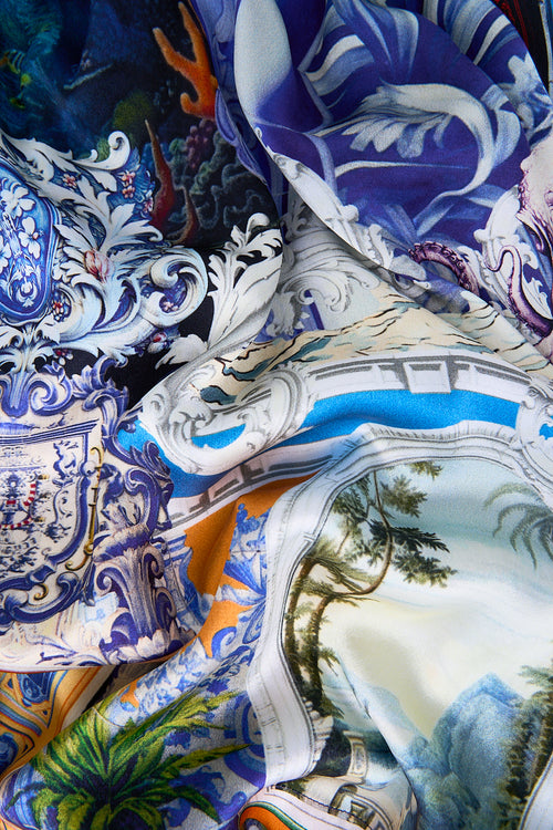 Designed in Australia, The Song Of Saint Anthony Maxi Wrap Skirt embarks on a fishing trip through Lisbon’s coastal charm, where hand-drawn creatures embody the spirit of the Saint Anthony Festival—oceanic and celebratory. Lovingly handcrafted with a focus on vivacious volume, this skirt features a cinching wrap waist detail adorned with crystal embellishments, adding a touch of opulence. The eternal A-line silhouette falls to full length as the skirt culminates in a flared hemline with side seam pockets. Create a sophisticated style moment with this sculptural CAMILLA maxi skirt.