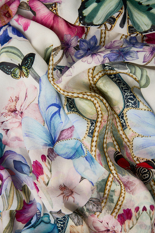 Designed in Australia, The Monserrate Magic Scrunchie With Trinket features a white base adorned with butterflies, leopards, and intricate details reflecting the palace's exotic gardens and eclectic architecture. Lovingly handcrafted, this luxury silk scrunchie showcases an elasticated body with a lavish tie detail. Adorned in a bespoke printed silk and finished with crystal embellishments, this designer hair accessory exudes unparalleled opulence.