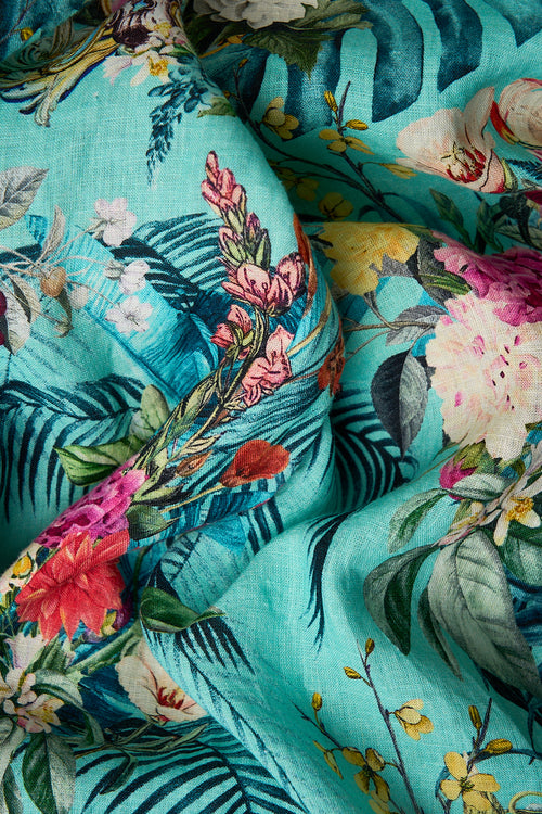 Designed in Australia, The Gardens Of Queluz Silk Shrug invites you into Queluz Palace, where vivid greens and lush florals blend with the elegance of Azulejo tiles, celebrating nature and artful design. Lovingly handcrafted, this