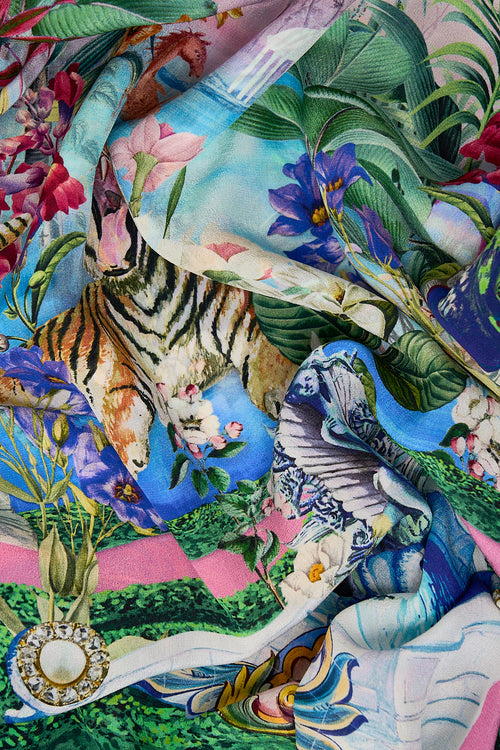 Designed in Australia, the Spirit Of Santa Maria Blouson Sleeve Bomber celebrates the vivid contrasts of Igreja Matriz De Santa Maria. Painterly prints reflect its dynamic artistry, steeped in timeless energy and colour. Lovingly handcrafted, this luxury silk bomber jacket features opulent hand embroidery and crystal embellishment. The relaxed blousy bodice sits neatly above level and the blouson sleeves allow effortless layering, tapering into neat ribbed cuffs at the wrist line.