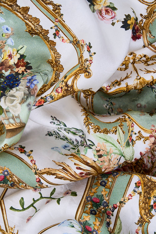 Designed in Australia, the Dressing Room Drama Tiered Long Shirt Dress unveils a black base fused with florals and gilded arches, echoing the regal opulence of the Palace of Queluz—a poetic nod to throne rooms