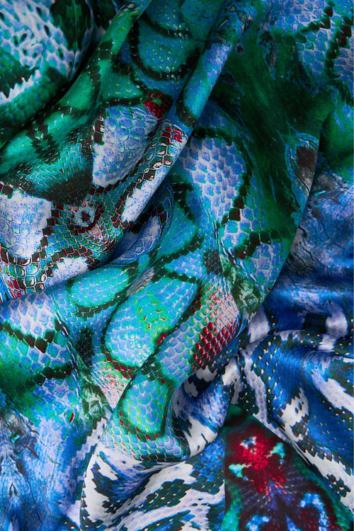 Designed in Australia, The Land Of Wonder Waisted Dress With Hem Ruffle embodies a mystical fusion of snakeskin and oceanic hues, celebrating the art of rebirth and reinvention. Lovingly handcrafted, this luxury CAMILLA silk maxi dress features a blousy bodice that cinches into the adjustable waistband. The softly gathered skirt flows from the waistband to create a flowy silhouette accentuated with a deep ruffle hemline.