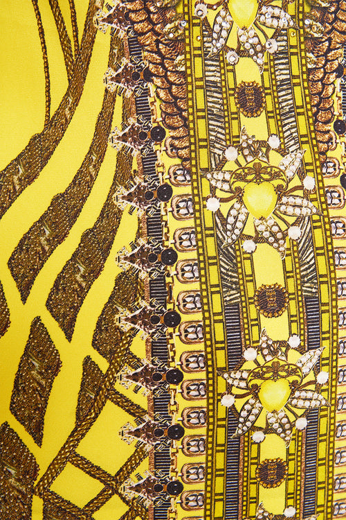 Designed in Australia, The Shrine Of Sunshine Short Bias Slip embraces the ethereal charm of ancient realms. This design features gleaming yellow tones interwoven with delicate flecks of gold, capturing the timeless elegance and divine