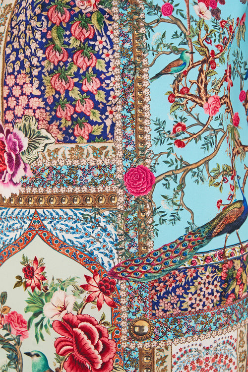 The Sultans And Queens Off Shoulder Short Dress is a handcrafted silk silhouette designed by our in house artisans. Reimagined in an exclusive limited edition print, our off the shoulder mini dress features a shirred waistband, neckline and cuffs for an adjustable, cinched fit. Feminine blouson sleeves and a flared hemline add soft volume, whilst crystal embellishments add subtle sparkle.