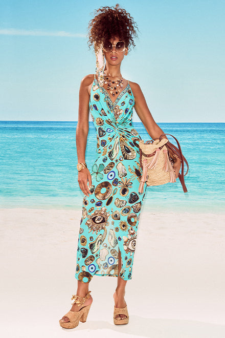 The Totems And Treasures Tuck Front Jersey Dress is a handcrafted silhouette designed by our in house artisans. Reimagined in an exclusive limited edition print, our full length jersey dress features a V neckline that