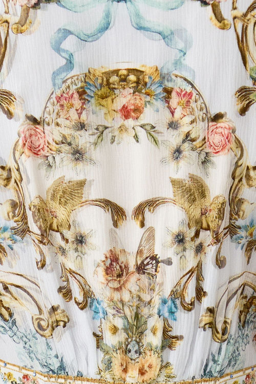 The Seville Sweetheart Button Shirt With Frill Detail is a handcrafted silhouette designed by our in-house artisans. A closet classic, this linen collared shirt is finished with a relaxed fit through the body and button front closure. Pops of print finish the décolletage as delicate frills adorn the back and sleeves, before intricately applied crystal embellishment completes the silhouette.